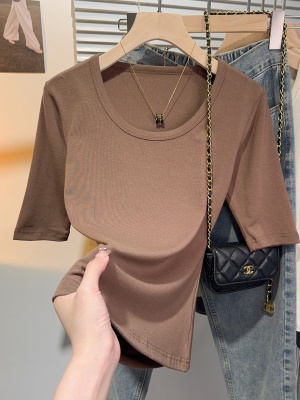 高级感甜美风中袖短袖T恤女夏正肩修身显瘦上衣u领百搭基础五分袖
