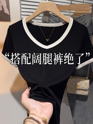 黑色螺纹冰丝短袖t恤女2025新款夏季V领撞色韩系复古减龄别致上衣