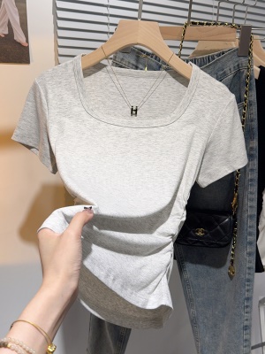 方领正肩短袖T恤女2025流行收腰高端高品质纯色修身减龄短款上衣