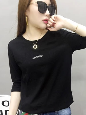 中袖t恤女士V领上衣修身黑色五分袖打底衫女内搭2025新款大码女装