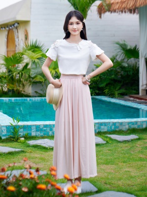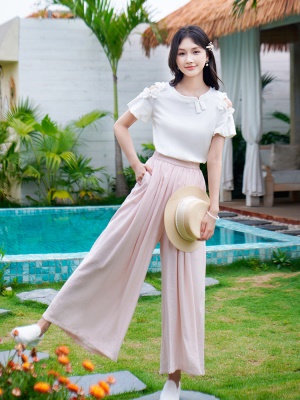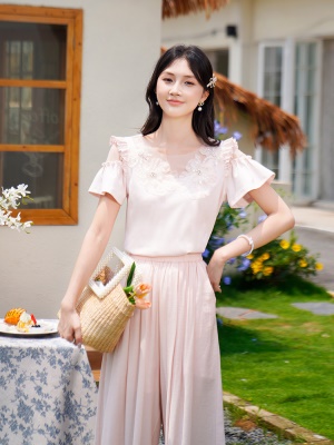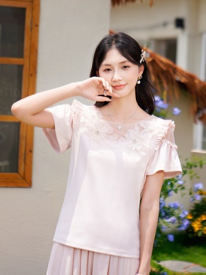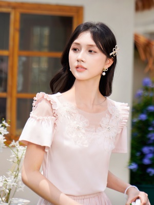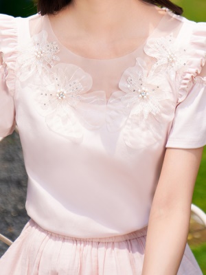 ATAR名媛淑女珍珠立体花短袖T恤 夏季新品网纱拼接荷叶袖粉色上衣