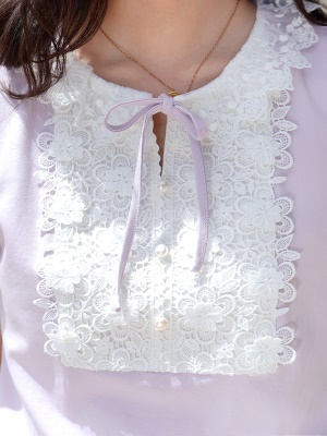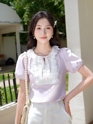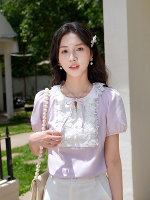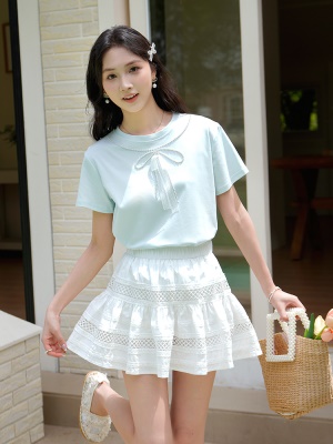 ATAR夏装新款甜心蕾丝花边拼接短袖T恤 2025女绣花拼色蝴蝶结上衣
