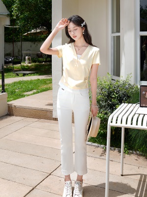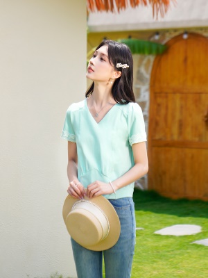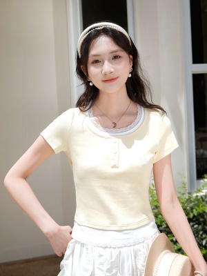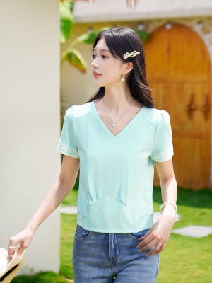 ATAR休闲夏季新款女蕾丝花边拼接V领短袖T恤202纯色显瘦高腰上衣