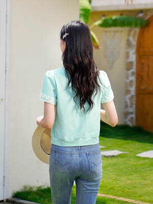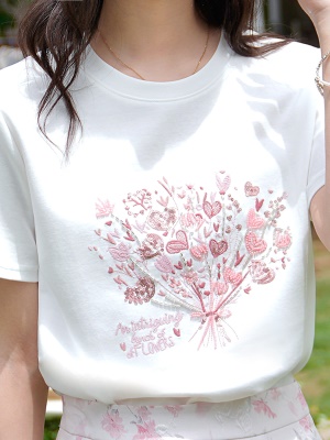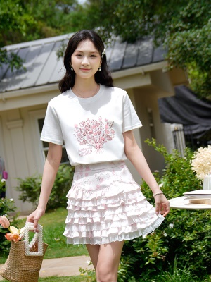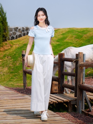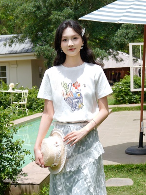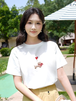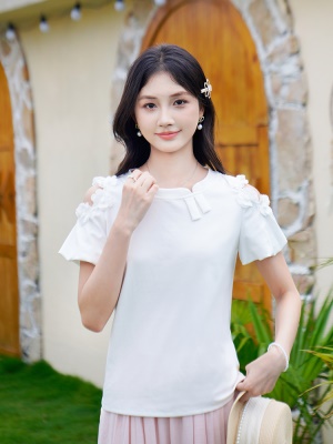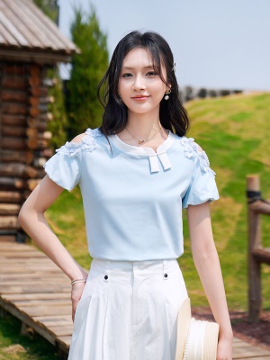 ATAR2025夏季新款甜美圆领短袖T恤绣花显瘦小心机露肩泡泡袖上衣