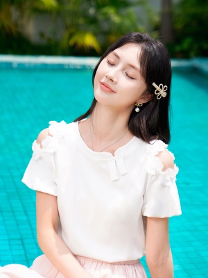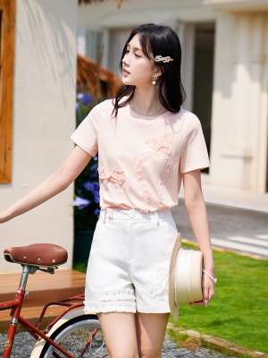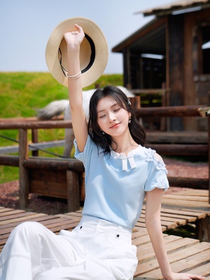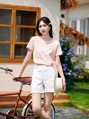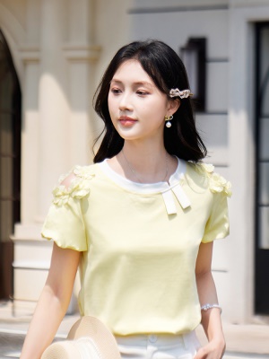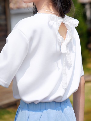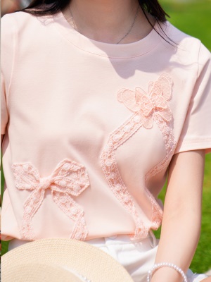 ATAR休闲夏季新品女蕾丝蝴蝶结T恤短袖立体花宽松显瘦圆领上衣潮