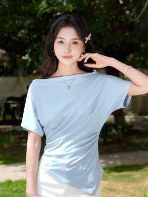 ATAR甜美女露肩斜肩短袖T恤2025夏季新品修身显瘦不规则褶皱上衣