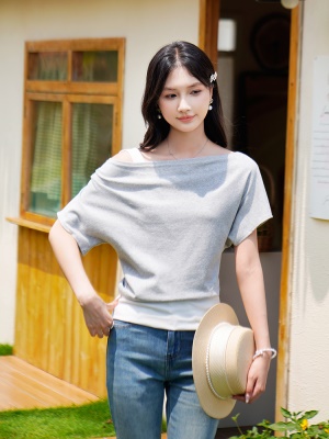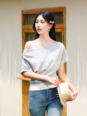 ATAR夏装新款女假两件露肩T恤 2025宽松舒适时尚收腰显瘦短袖上衣