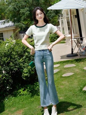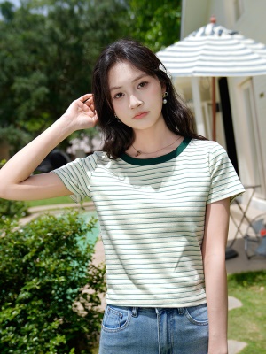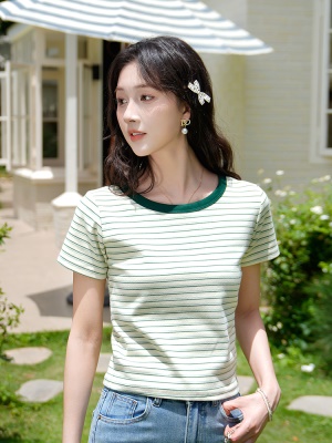 ATAR小清新休闲绿条纹短袖T恤 2025夏季新品女装圆领拼色针织上衣