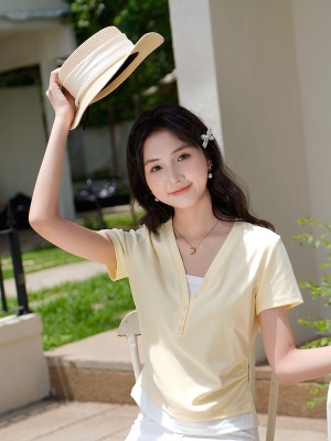 ATAR休闲V领假两件短袖T恤女夏季2025新款修身韩版打底衫内搭上衣
