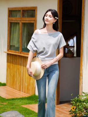 ATAR洋气夏季新品女装灯笼袖立体花瓣露肩T恤 2025斜开叉修身上衣