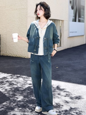 新中式牛仔阔腿裤套装女2025秋装新款时尚休闲立领欧货盘扣两件套