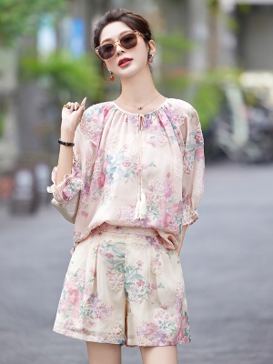 时尚宽松蝴蝶印花套装女2025夏季新款轻薄气质防晒短裤雪纺两件套