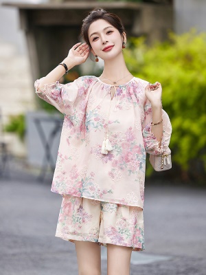 新中式印花雪纺凉快套装女2025夏季新款遮肚子漂亮时尚短裤两件套