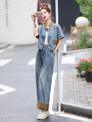 牛仔外套女2025新款爆款春季百搭套装新中式国风盘扣阔腿裤两件套