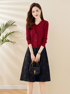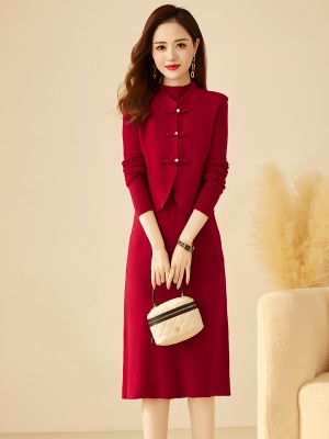小香风女装订婚套装2025春秋冬新款国风针织红色时尚连衣裙两件套
