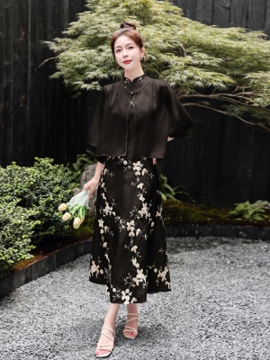 国风复古醋酸套装裙子女夏新款时尚洋气年轻旗袍吊带连衣裙两件套