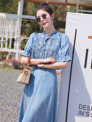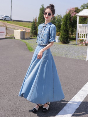 中国风天丝牛仔套装裙女夏季2025新款时尚复古盘扣半身长裙两件套