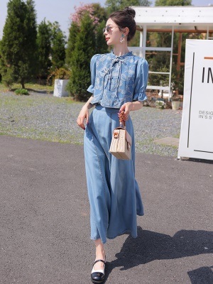 欧货国风盘扣牛仔套装女夏2025新款气质拼接漂亮时尚直筒裤两件套
