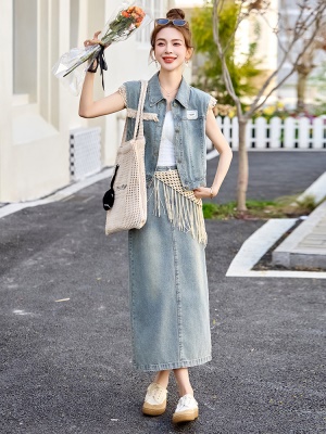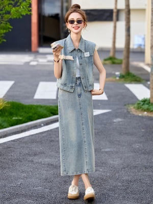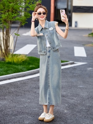 薄款复古牛仔套装女2025夏季新款时尚坎肩马甲爆款半身长裙两件套