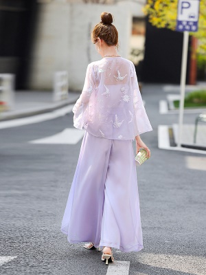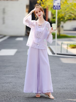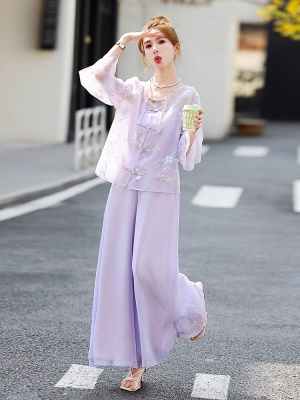 新中式刺绣紫色套装女2025夏季新款高级感优雅仙气阔腿裙裤三件套