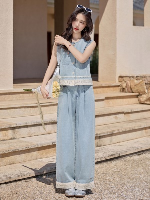 小香风蕾丝拼接无袖套装女2025夏季新款时尚薄款牛仔阔腿裤两件套