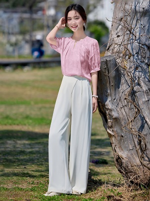 时尚中袖棉麻套装女夏新款高端刺绣天丝网纱上衣亚麻阔腿裤两件套