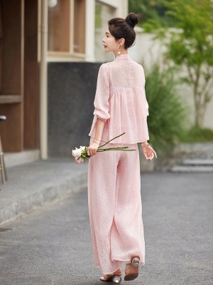 新中式雪纺套装女2025夏季新款粉色遮肚子洋气时尚三件套阔腿裙裤