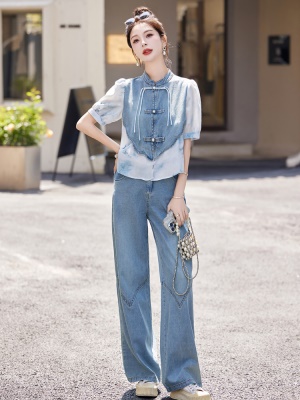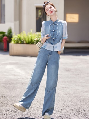 拼接衬衣天丝套装女2025夏天新品薄款盘扣新中式干练气质两件套裤