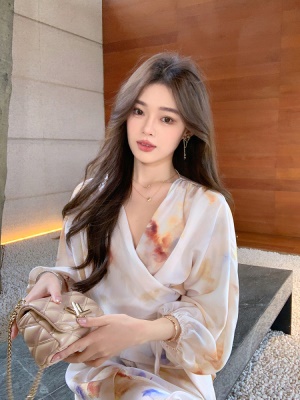 ByYou 夏季新款黄色灯笼袖V领雪纺碎花连衣裙中长款收腰显瘦裙子