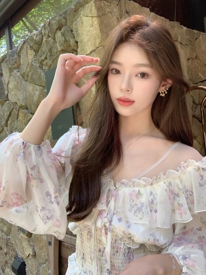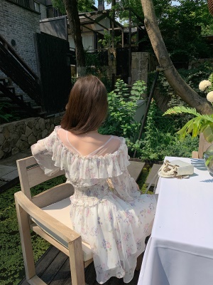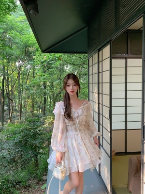 ByYou 夏季新款灯笼袖网纱V领碎花雪纺连衣裙收腰荷叶边短款裙子