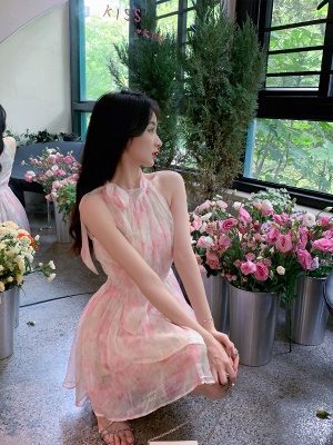 ByYou 夏季新款度假风荡领雪纺吊带连衣裙长款印花收腰包臀裙长裙