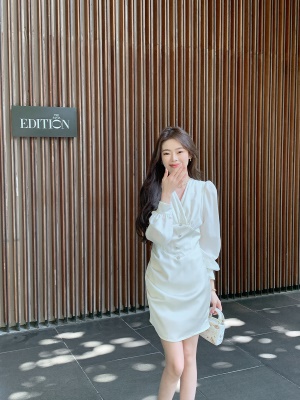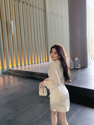 ByYou 夏季新款珠光白色缎面拼雪纺连衣裙泡泡袖V领收腰包臀短裙