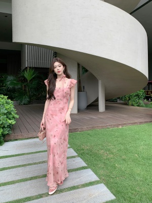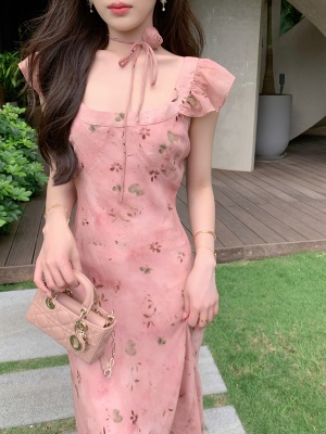 ByYou 夏季新款小飞袖方领粉色雪纺碎花连衣裙高级感修身包臀长裙