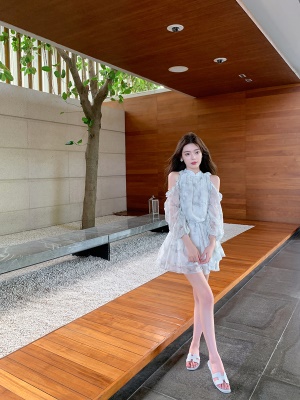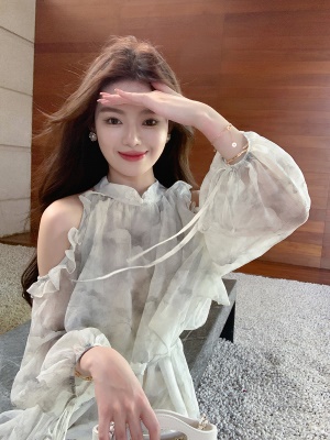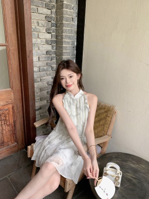 ByYou 夏季新中式仙气露肩印花雪纺挂脖连衣裙国风收腰显瘦短裙子