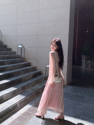 ByYou 清冷感女神淡粉色无袖挂脖雪纺连衣裙中长款露肩气质仙女裙