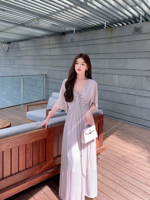 ByYou 2025新款温柔风灰色荷叶袖v领收腰连衣裙大摆宽松气质长裙
