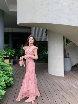 ByYou 夏季新款杏色小飞袖方领雪纺碎花连衣裙长款显瘦包臀鱼尾裙