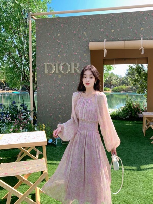 2025新款雪纺碎花连衣裙女夏季小清新收腰显瘦气质喇叭袖裙子超仙
