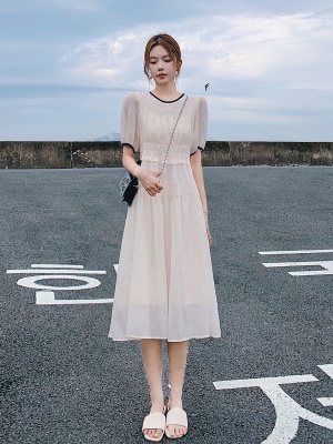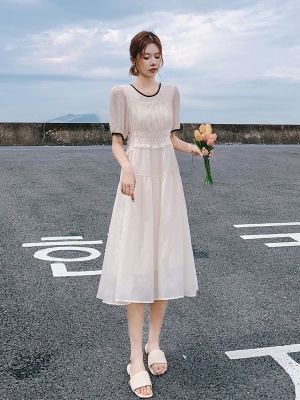 温柔风白色雪纺连衣裙女夏季2025新款泡泡袖气质显瘦收腰a字裙子