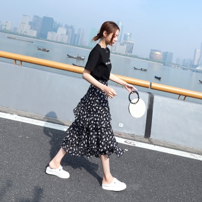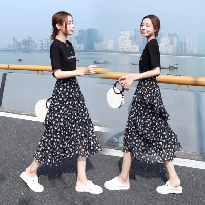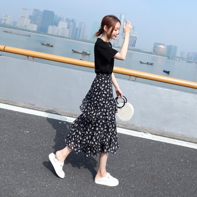 雪纺连衣裙2025夏季新款碎花时尚套装中长款T恤半身裙两件套a字裙
