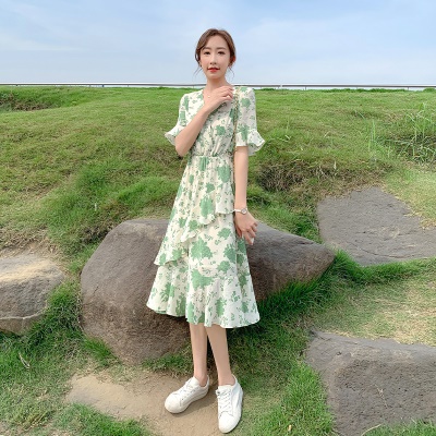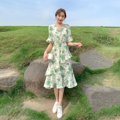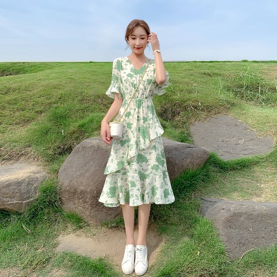 绿色温柔风雪纺碎花连衣裙女夏季2025新款收腰显瘦气质a字裙子仙