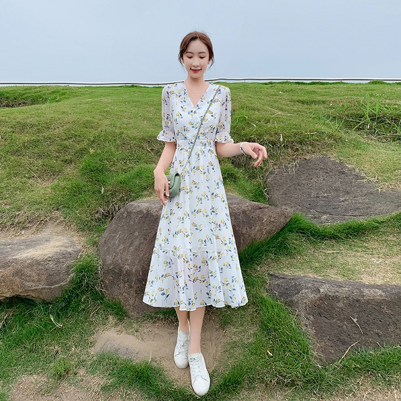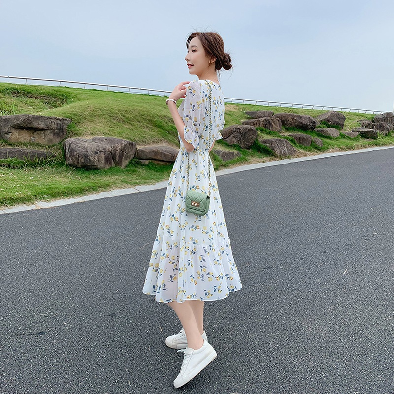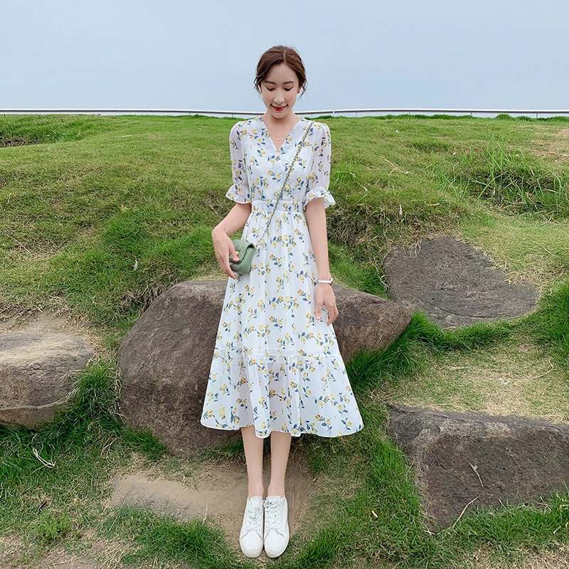 ByYou 夏季新款荷叶领灯笼袖白色雪纺碎花连衣裙收腰显瘦掐腰长裙