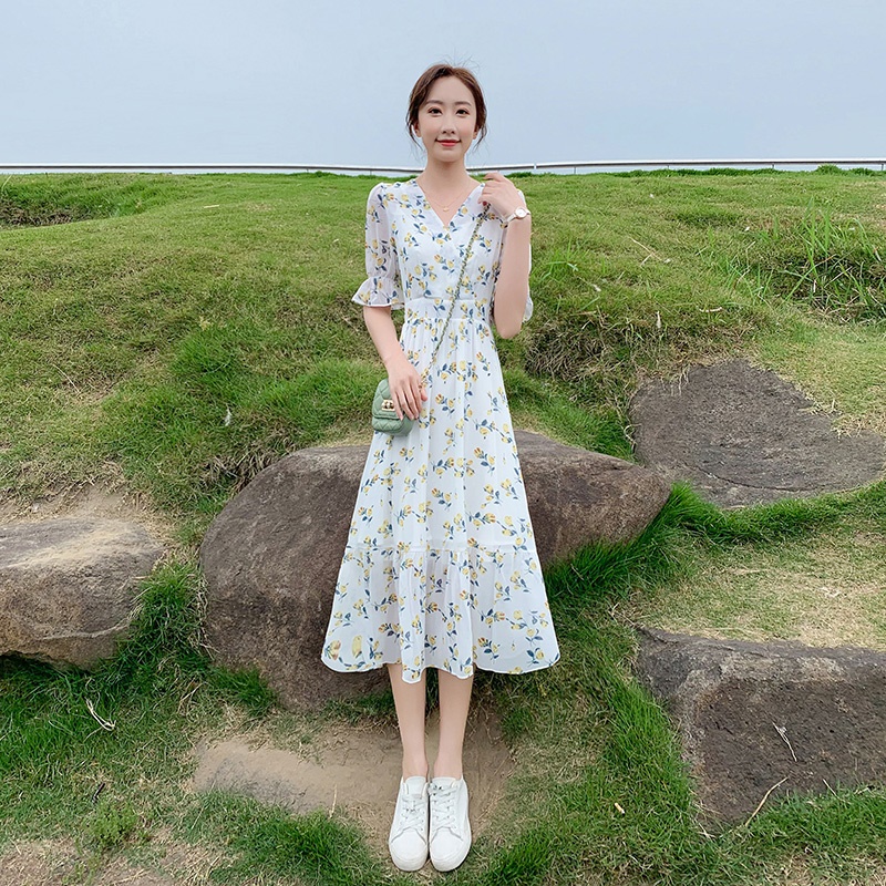 雪纺碎花连衣裙女夏季2025新款喇叭袖修身收腰显瘦气质a字裙子仙