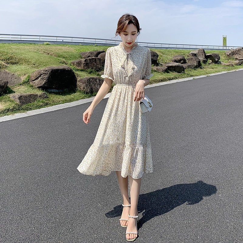 ByYou 夏季新款荷叶领灯笼袖白色雪纺碎花连衣裙收腰显瘦掐腰长裙
