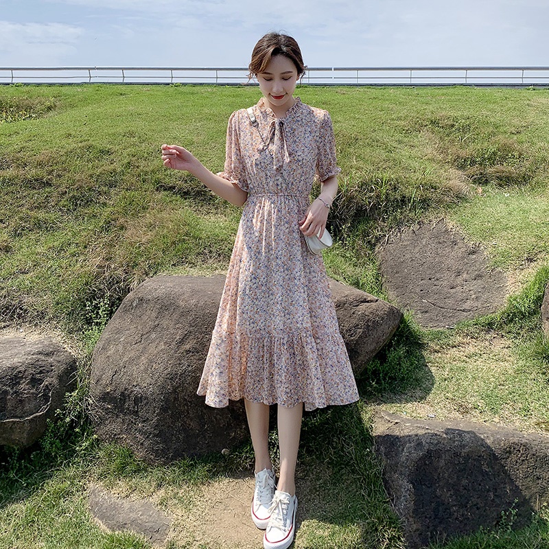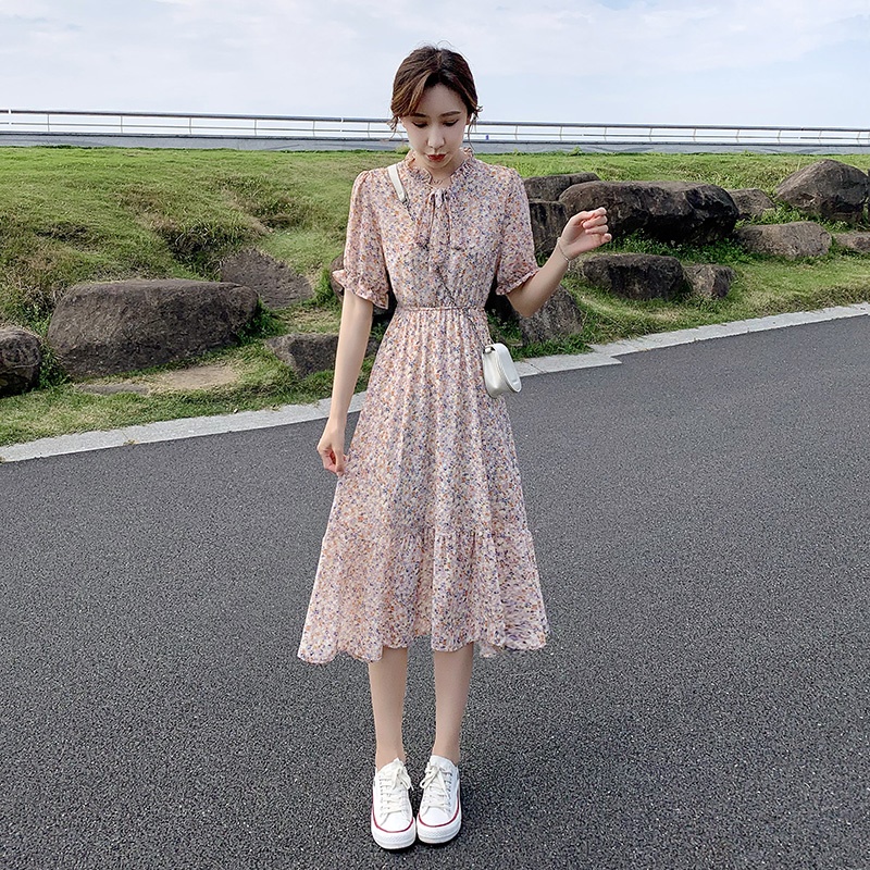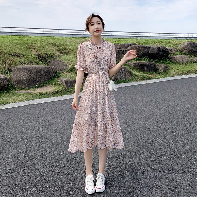 粉色甜美小清新雪纺碎花连衣裙女夏2025新款显瘦气质收腰a字裙子