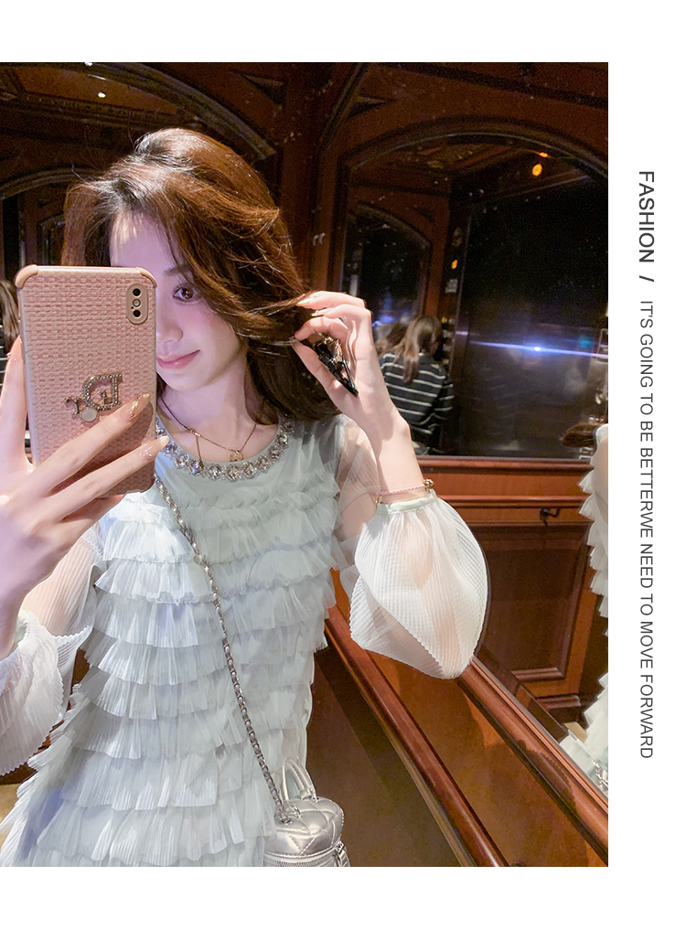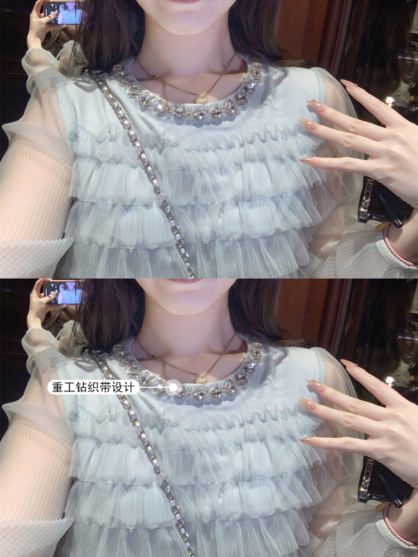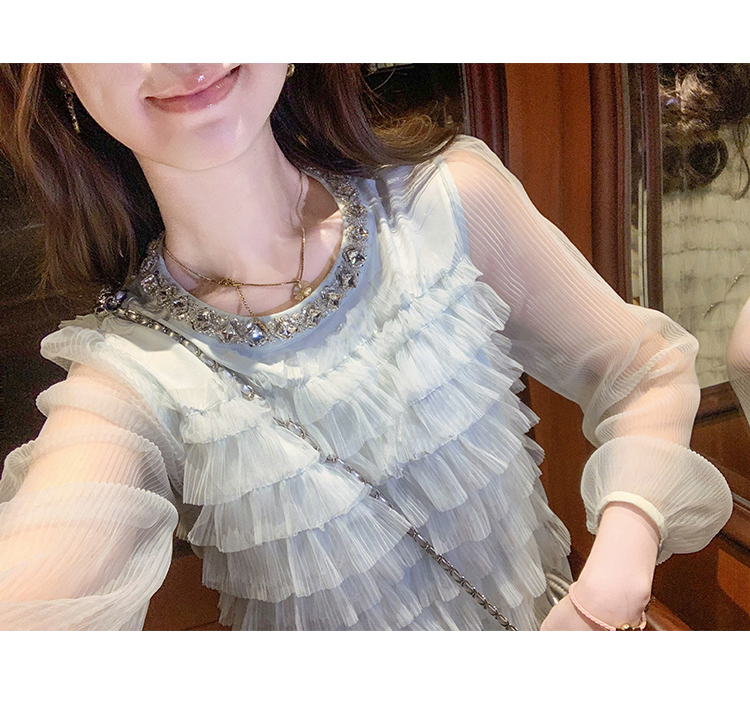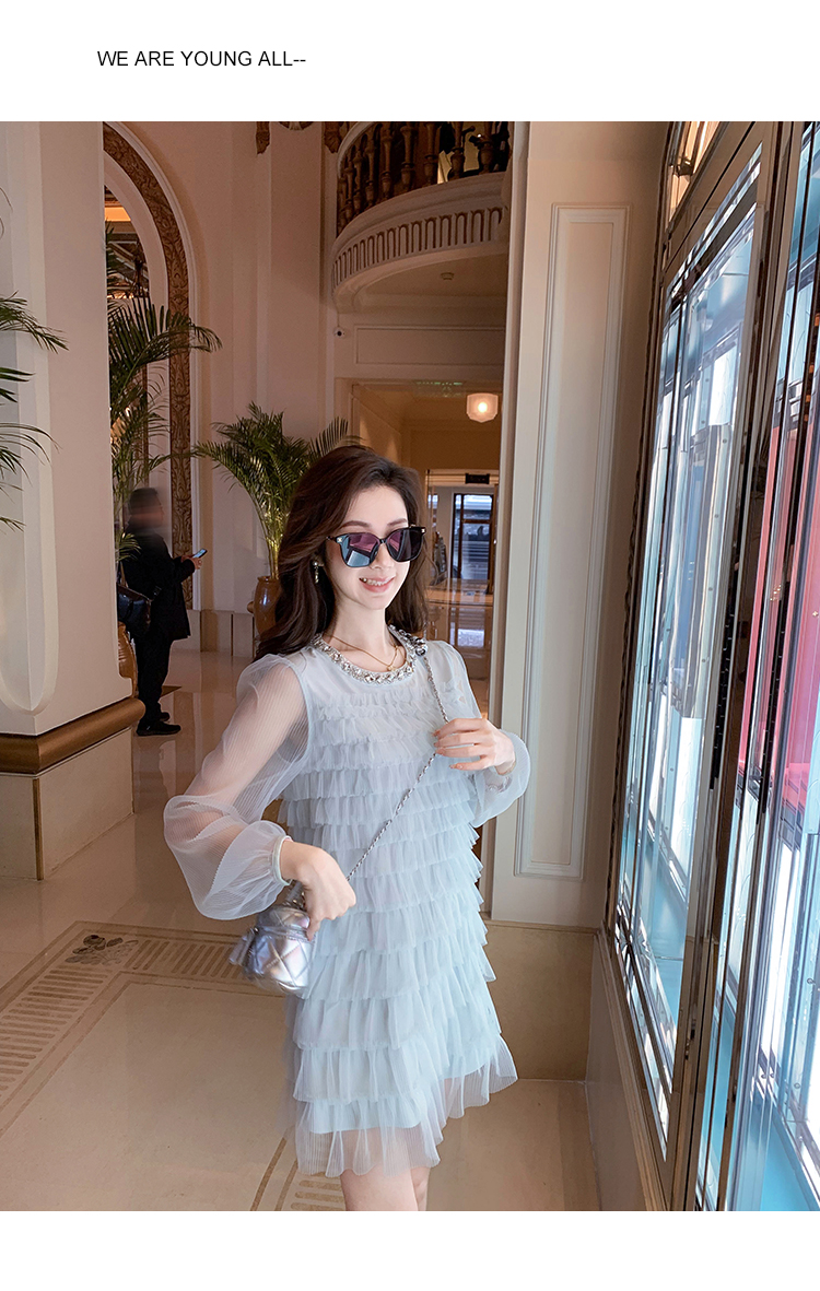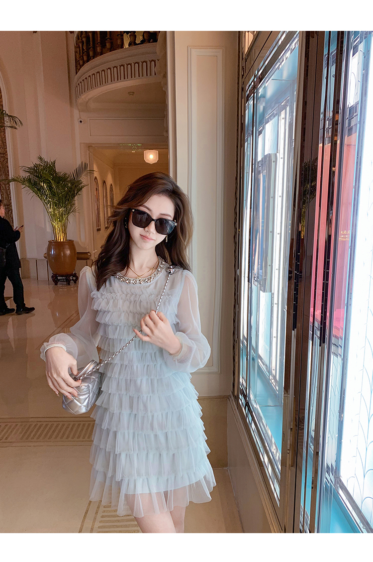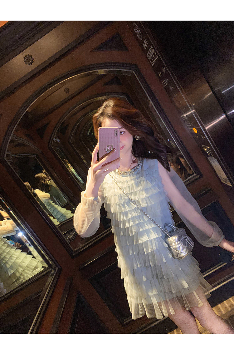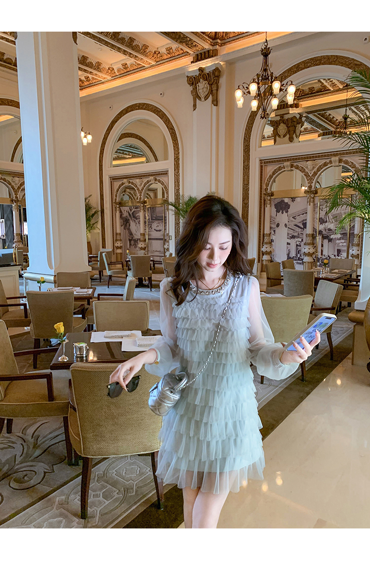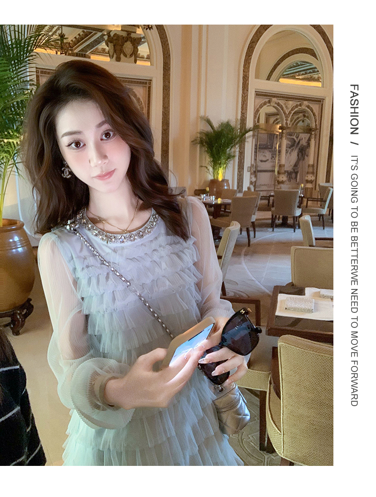 「青翠蓬蓬」钉珠纺纱蛋糕裙女新款气质薄纱连衣裙