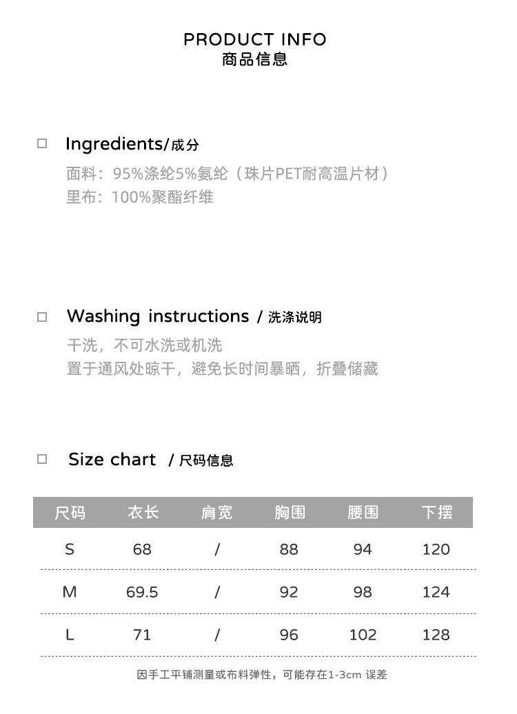 - 聚对苯二甲酸乙二酯(涤纶)95% 聚氨酯弹性纤维(氨纶)5%