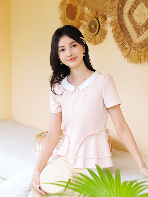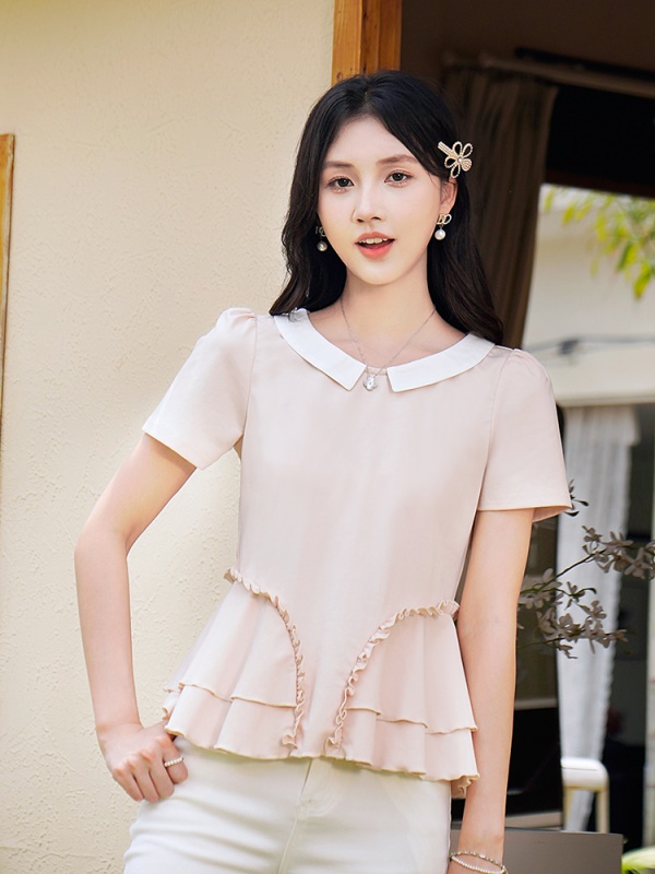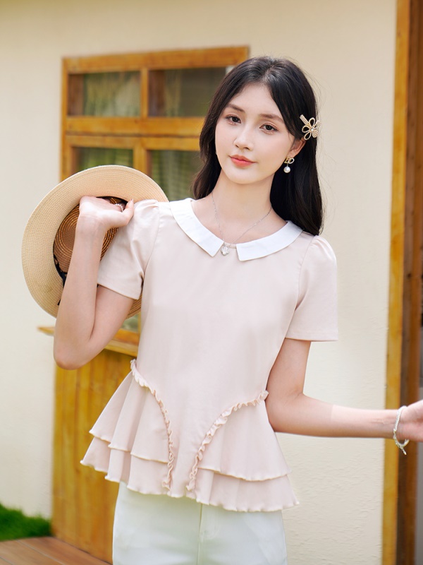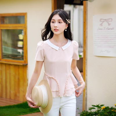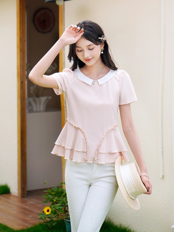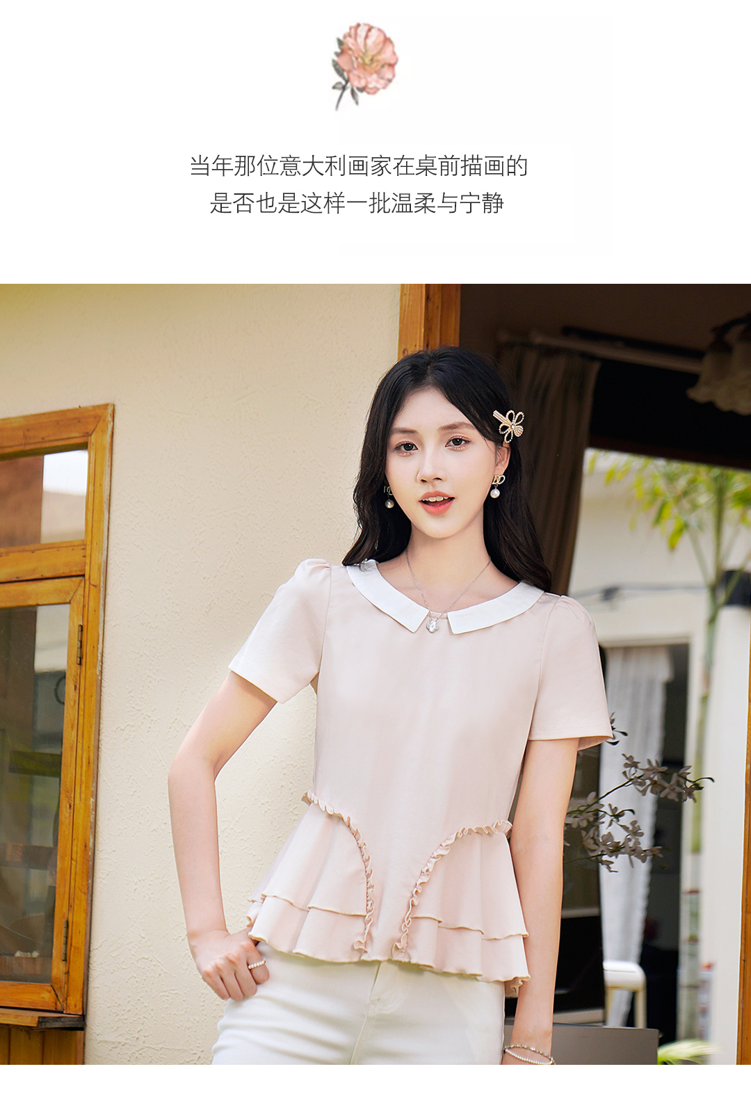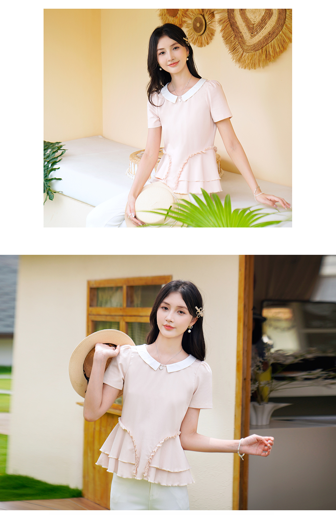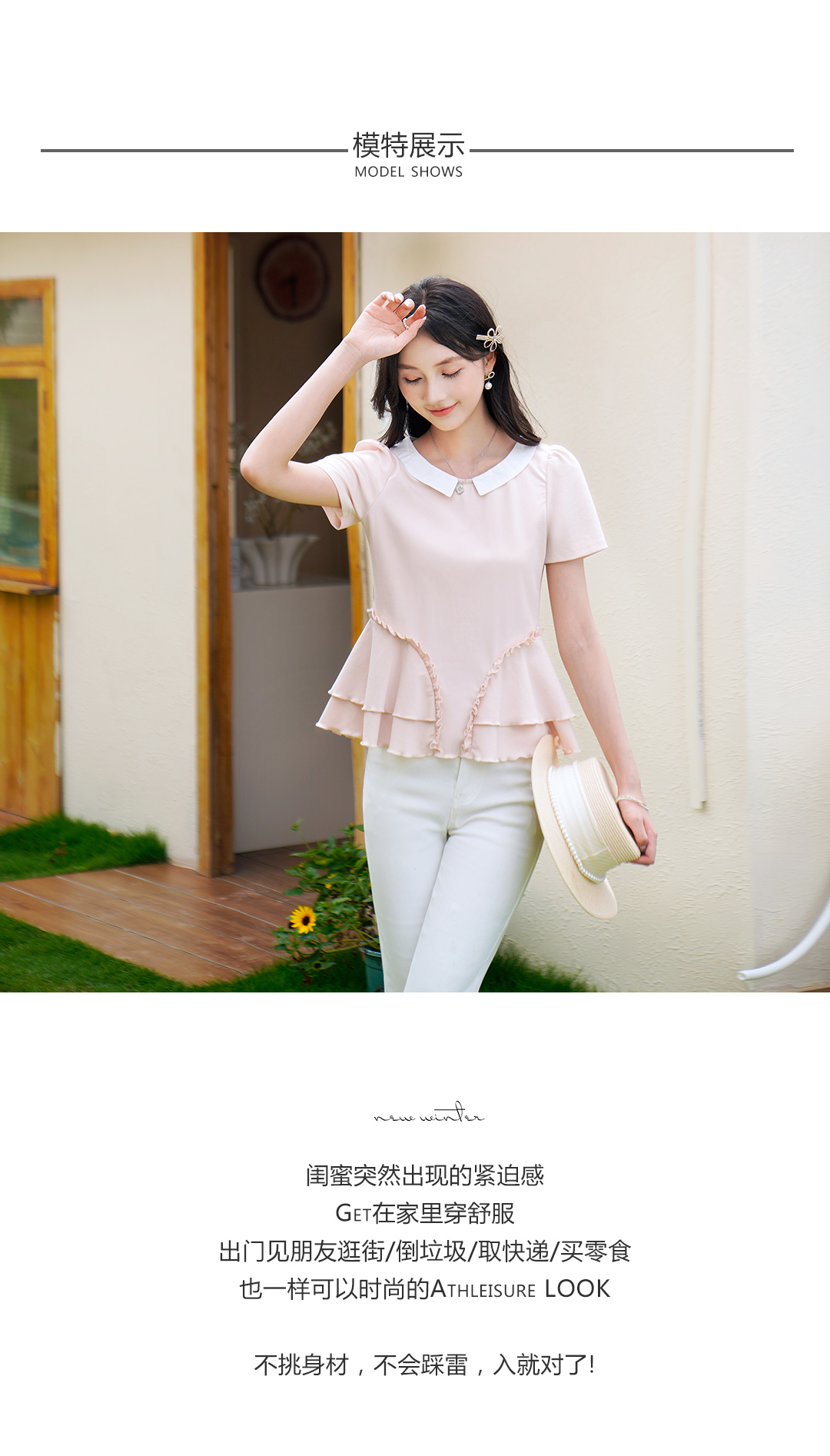 ATAR气质女夏日新品娃娃领木耳拼接短袖T恤 撞色双层下摆针织上衣
