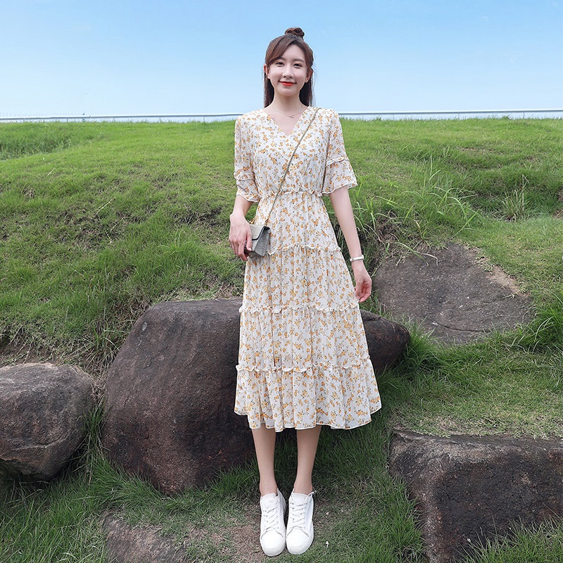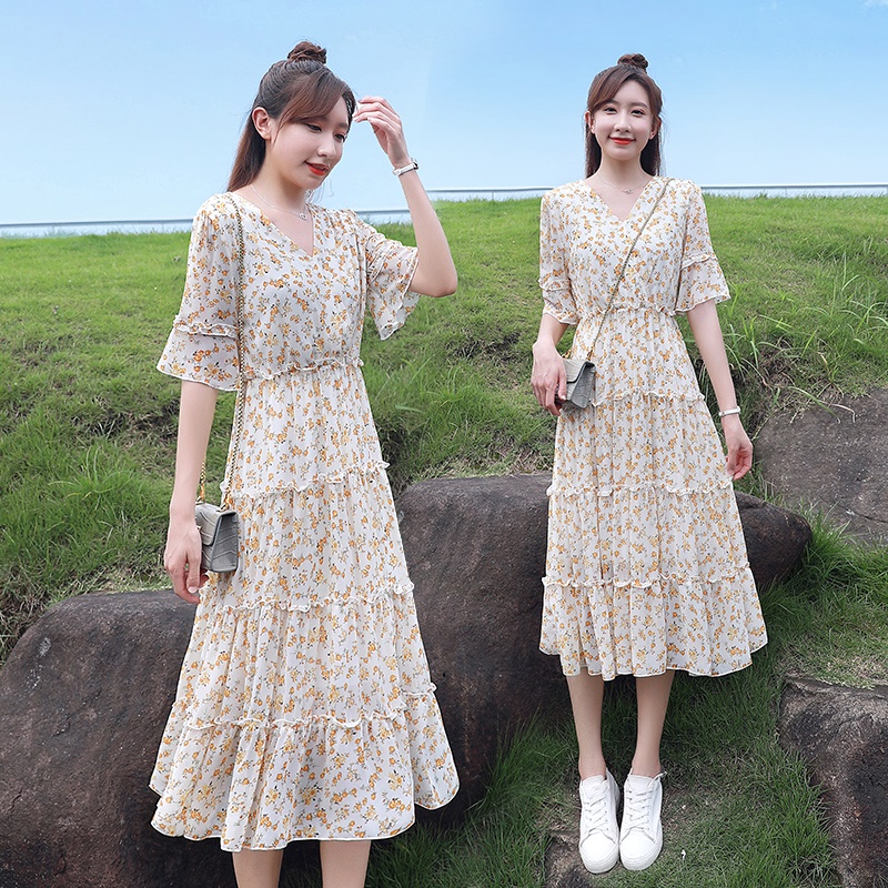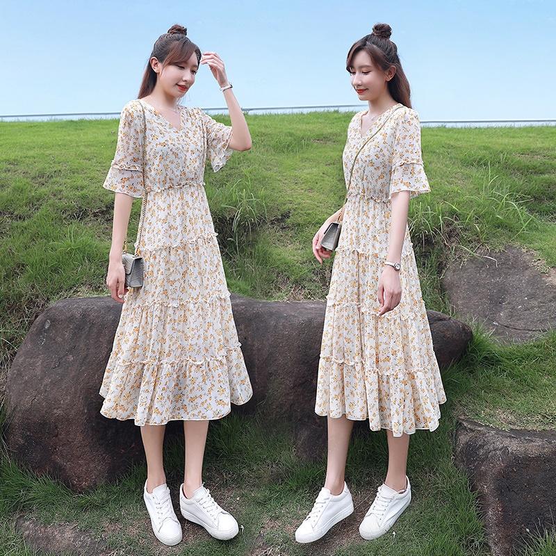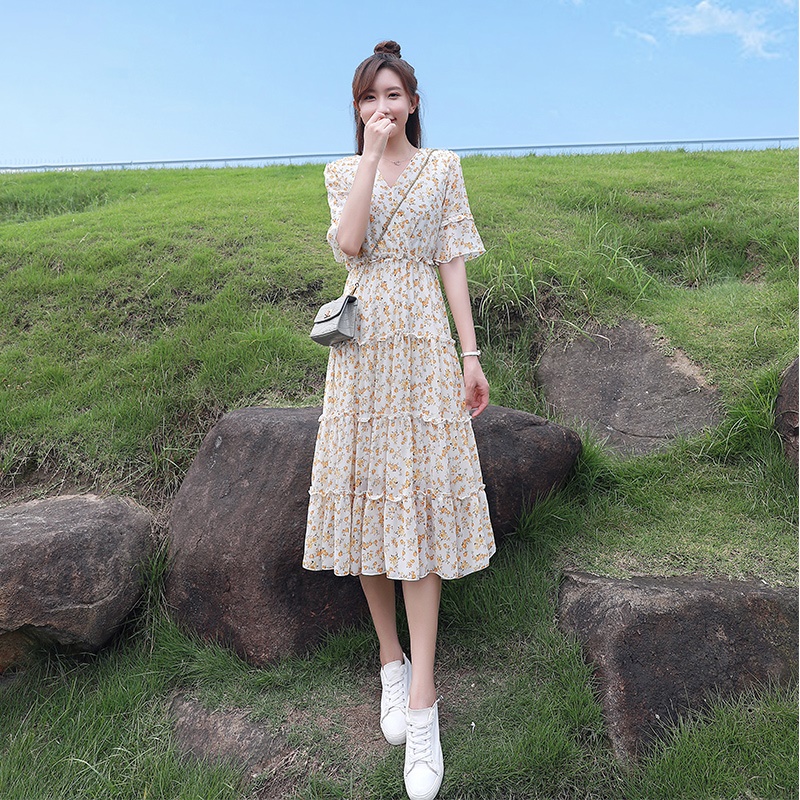 小个子碎花雪纺连衣裙女夏季2025新款收腰显瘦气质v领a字裙子女仙