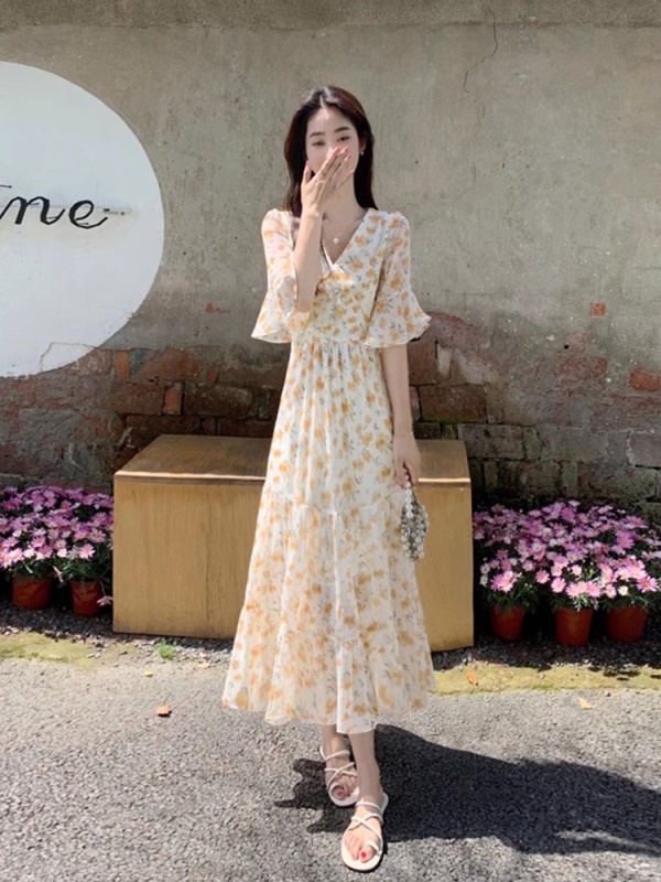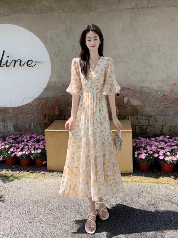 商品名称:法式碎花雪纺连衣裙子女2025新款夏季v领气质显瘦长裙a字裙超仙女